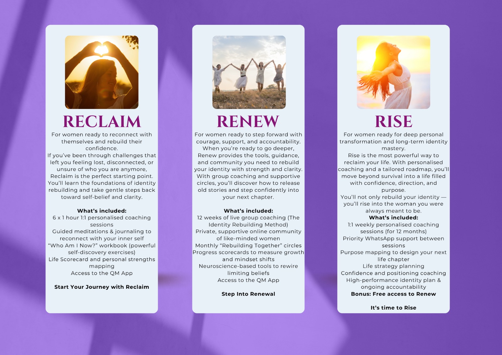 This 12-week program combines Quality Mind Global’s proven Transform framework with the Identity Rebuilding Method, tailored specifically for women navigatingThis 12-week program combines Quality Mind Global’s proven Transform framework with the Identity Rebuilding Method, tailored specifically for women navigating unexpected life changes, uncertainty, and the challenges of rebuilding after plans don’t go as expected.